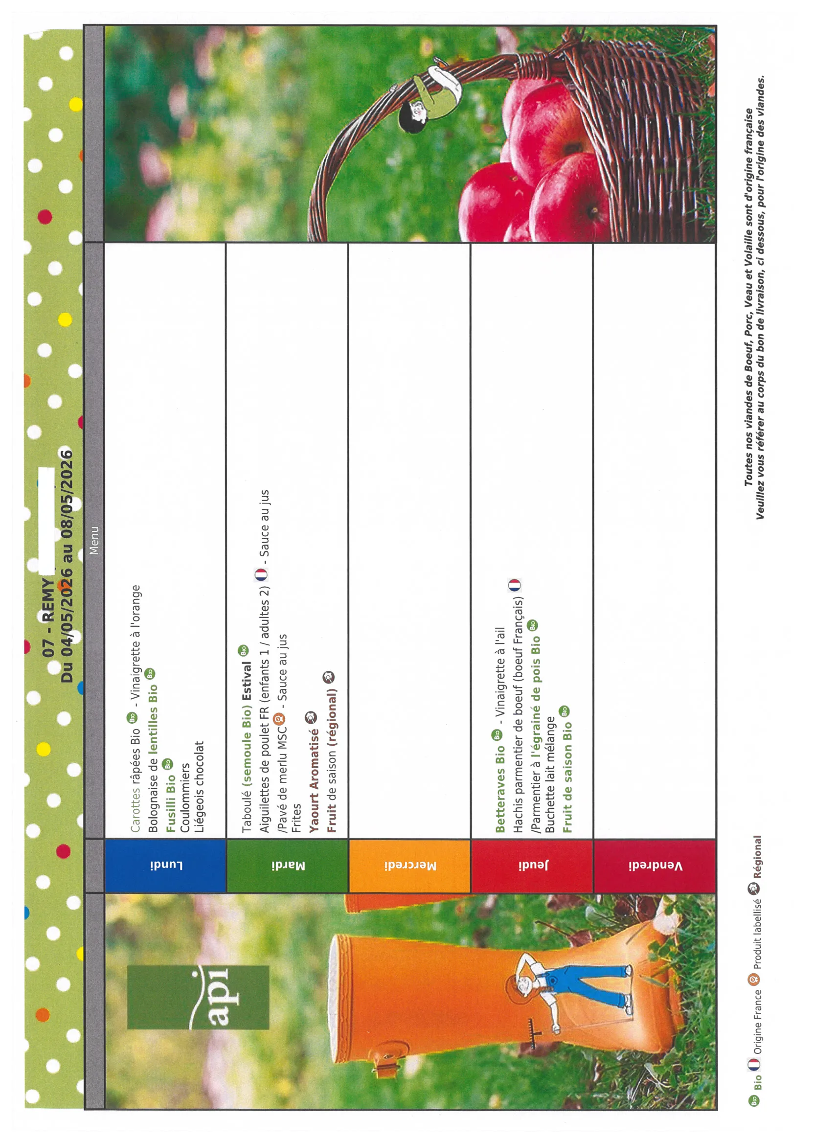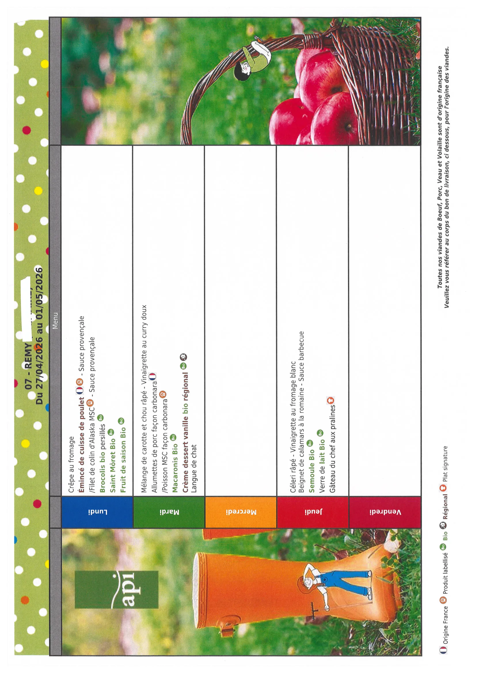 Vous trouverez ci-dessous, les menus de la restauration scolaire :